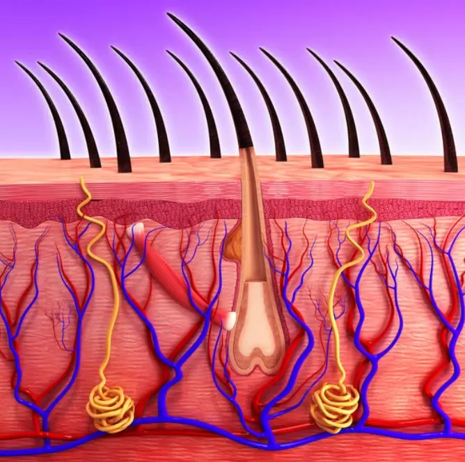 Illustration depicting the structure of human hair follicles beneath the skin's surface. The image shows several hair strands emerging from the scalp, with detailed representation of the follicle, sebaceous glands, and associated blood vessels. The vibrant colors highlight the layers of skin, emphasizing the biological components involved in hair growth and nourishment. This educational graphic serves as a visual aid for understanding hair anatomy and its physiological processes. Ideal for studies in dermatology or cosmetology.